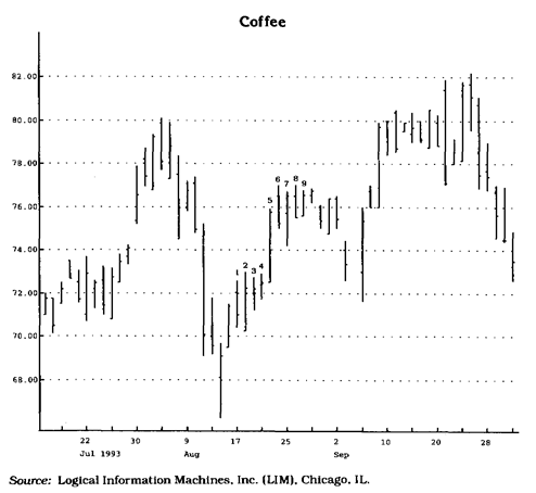 Рис. 7.7 На этом графике можно сосчитать девять последовательных дней, в каждый из которых цена закрытия больше цены закрытия четыре торговых дня тому назад, — другими словами, сформирован установочный набор на продажу. Обратите внимание, как после формирования установочного набора наблюдается ценовой "кашель" или "заикание", как я их называю. Довольно часто, хотя и не всегда, после завершения формирования установочного набора цены останавливаются или разворачиваются.