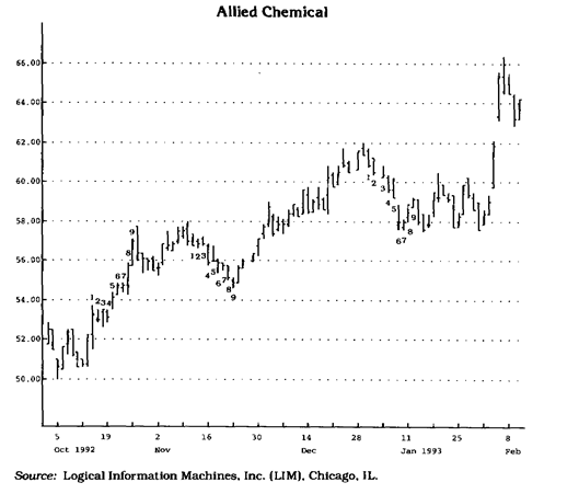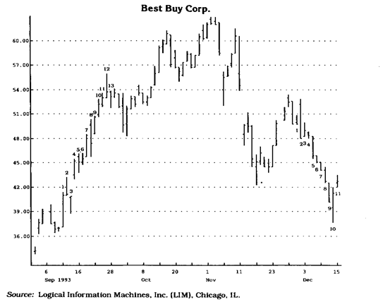 Рис, 7-6 Цена закрытия в день В больше или равна цене закрытия в день А. Цена закрытия на следующий день меньше цены закрытия четыре дня тому назад, и этому дню присваивается номер 1 в установочном наборе. Обратите внимание, что девятый день оказался последним днем нисходящей тенденции — рынок достиг основания.
