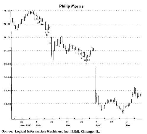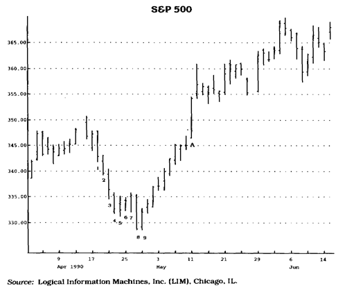 Как это видно из приведенных примеров, довольно часто сразу после формирования девятидневной установки происходит краткосрочный подъем цен или даже перелом нисходящей тенденции. Если только рынок не находится в свободном падении или в режиме краткосрочной коррекции при восходящей тенденции, то эти отрывистые "покашливания" представляют собой лишь небольшую отсрочку в развитии нисходящей тенденции, после которой падение цен продолжится.