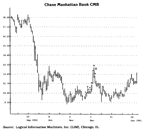 Рис. 7.40 Как видно из графика, возрастающий девятидневный установочный набор, отмеченный цифрами, не превзошел максимальный уровень убывающего установочного набора, начавшегося за 11 дней до октябрьского ценового минимума.