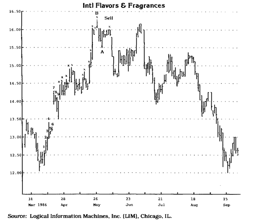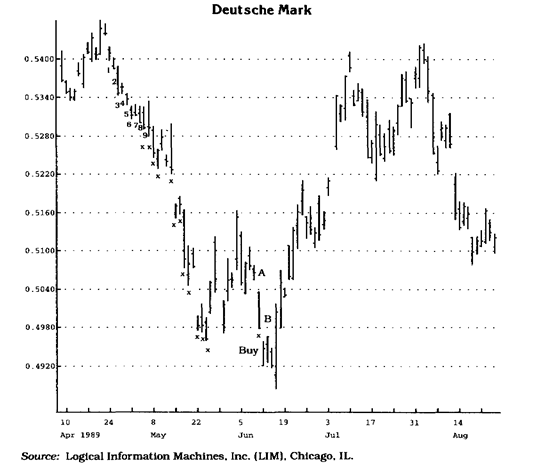 Рис. 7-43 Для определения уровня сгоп-лосс следует рассчитать истинный ценовой диапазон дня с наименьшим внутридневным минимумом (покупка) или дня с наибольшим внутриднев-ным максимумом (продажа). В случае покупки необходимо вычесть данную величину из минимальной цены за период формирования установочного набора и отсчета. Для определения уровня сгоп-лосс после продажи используется обратная процедура: в этом примере разность между точкой А (цена закрытия в предыдущий день) и максимальной ценой (точка В) прибавляется к точке В. Если цена закрытия окажется выше этого значения, сработает сигнал сгоп-лосс.