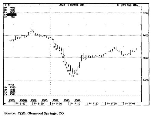 Я был убежден, что система, описанная в данной главе, хорошо работает применительно к дневным графикам. Время от времени я пробовал анализировать с ее помощью графики, построенные на более коротких временных интервалах, и обнаружил, что в этих случаях она также работает хорошо. Хотя я и не рекомендую использование Секвенты™ для анализа каких-либо графиков, кроме дневных, рисунок 7.44 иллюстрирует ее успешное применение на минутном графике японской иены.