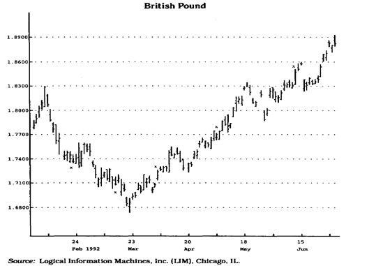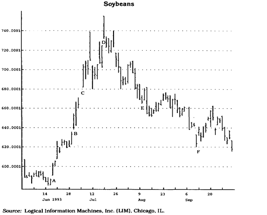 Более того, в понедельник обычно проводятся заседания комитетов, на которых все факты тщательно анализируются и решения принимаются по зрелому размышлению, а не под влиянием эмоций. Я обращаю особое внимание на ценовые разрывы, появляющиеся в Понедельник, и часто анализирую недельные графики, где их довольно легко заметить. С помощью других параметров, упомянутых выше, — времени и объема — можно еще более точно оценить подлинность таких ценовых разрывов и их возможное влияние на последующее движение цен.
