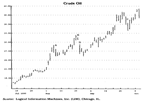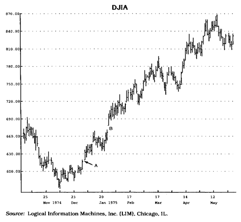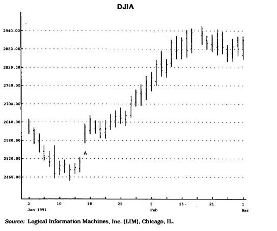 Рис. 8.6 В связи с нефтяным кризисом на Ближнем Востоке и угрозой вовлечения США в военные действия по урегулированию конфликта ожидалось падение котировок на фондовом рынке. Совершенно неожиданно промышленный индекс Доу-Джонса резко пошел вверх, начиная с ценового разрыва вверх в точке А.