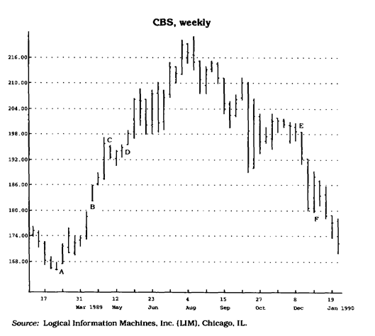 Рис. 8.5 Ценовые разрывы (разрывы с пересечением), происходящие по понедельникам, легко выявляются на недельном графике. Они происходили в точках А, В, С, D, Е и F.