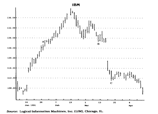 Рис. 8.7 Цена закрытия на восьмой день после разрыва (А) оказалась выше цен закрытия всех предшествующих семи дней. Это говорит об истинности ценового разрыва и о вероятности продолжения тенденции. Аналогичный сигнал в обратном направлении был зарегистрирован при разрыве вниз с пересечением и подтвердился десять дней спустя экстремальной ценой закрытия (В). На восьмой, девятый и десятый день после разрыва вниз в точке С также появилось аналогичное указание.