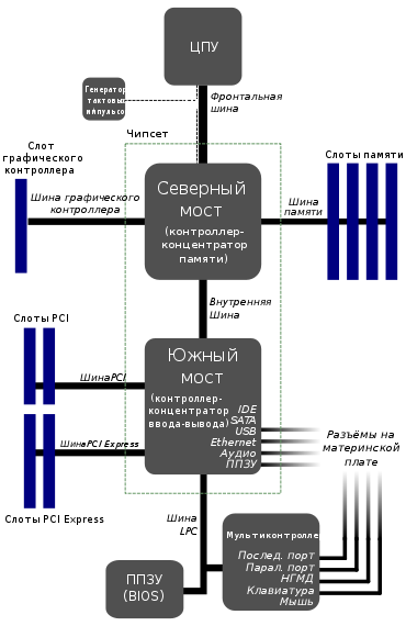 Производительность процессора и ПК в целом существенно зависит от типа чипсета. Чипсет (англ. chipset) — набор микросхем, спроектированных для совместной работы с целью выполнения набора каких-либо функций. Чипсет, размещаемый на материнской плате выполняет роль связующего компонента, обеспечивающего совместное функционирование подсистем памяти, центрального процессора и прочих устройств ПК.