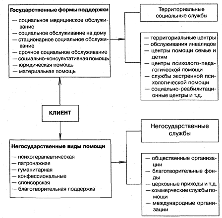 Понятие «социальная служба» относится к основным понятиям в социальном обслуживании населения и определяется как система государственных и негосударственных структур, осуществляющих социальную работу и имеющих в своем составе специальные учреждения для оказания социальных услуг и органы управления ими.