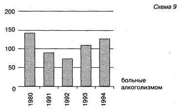 По данным Всемирной организации здравоохранения алкоголизмом страдают мужчины чаще, чем женщины. Однако если разрыв между мужчинами и женщинами в начале века составлял 1:10, то в конце века он снизился до 1:5. Поло-ролевые стереотипы и социальные установки накладывают определенный отпечаток на формирование у мужчин алкогольной зависимости. Стрессы, дезадаптивные факторы, семейные, конфликты, финансовые проблемы, неурядицы на работе, разводы провоцируют развитие алкоголизма. Алкоголь выступает психотропным средством различного действия. В зависимости от дозы он может оказывать эйфоризирующее, антидепрессивное, снотворное действие. При постоянном употреблении алкоголя, постепенно формируется синдром алкогольной зависимости, который приводит не только к различным видам заболеваний (диабеты, гепатиты, циррозы и т.д.), но и к различным формам насилия в семье и обществе. Сегодня в РФ можно наблюдать рост алкоголизации населения. Если в 1991 г. под диспансерным наблюдением было 224,9 тыс. человек, то в 1994 — 237,5 тыс. человек. Соотношение страдающих алкоголизмом мужчин и женщин составляет 1:5, но можно констатировать рост мужского алкоголизма. В диаграмме показана тенденция заболеваний населения алкоголизмом на 100 тыс. населения6.