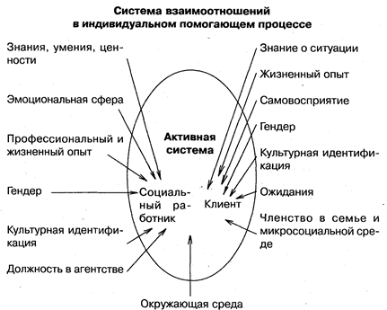 Ситуация «один на один», предполагает определенные отношения между социальным работником и клиентом. В процессе индивидуальной помощи не только планируется соответствующая процедура взаимодействий, но и выдвигаются специфические требования к ролям социального работника, необходимым знаниям о клиенте, обеспечивающие условия для работы в системе «один на один».