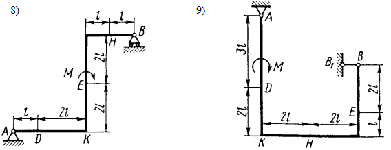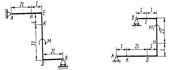 Определить реакции связей в точках закрепления, вызываемые заданными нагрузками. При окончательных подсчетах принять l = 0,5 м.