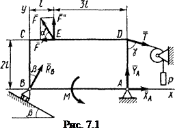 Дано: F = 25 кН; а = 60°; Р = 18 кН; γ = 75°; М = 50 кНּм; β = 30°; l = 0,5 м.
