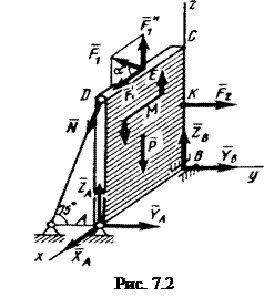 Вертикальная прямоугольная плита весом Р (рис. 7.2) закреплена сферическим шарниром в точке А, цилиндрическим (подшипником) в точке В и невесомым стержнем DD', лежащим в плоскости, параллельной плоскости yz. На плиту действуют сила