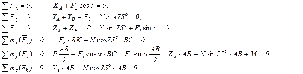 2. Для определения шести неизвестных реакций составляем шесть уравнений равновесия действующей на плиту пространственной системы сил: