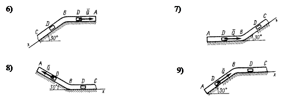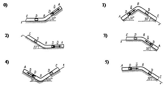 Груз D массой т, получив в точке А начальную скорость v0, движется в изогнутой трубе AВС, расположенной в вертикальной плоскости; участки трубы или оба наклонные, или один горизонтальный, а другой наклонный. На участке АВ на груз, кроме силы тяжести, действуют постоянная сила