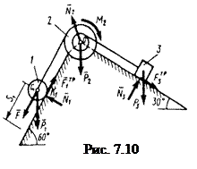 Механическая система (рис. 7.10) состоит из сплошного цилиндрического катка 1, ступенчатого шкива 2 с радиусами ступеней R2 и r2, (масса шкива равномерно распределена по его внешнему ободу) и груза 3 (коэффициент трения груза о плоскость равен f). Тела системы соединены друг с другом нитями, намотанными на шкив 2.