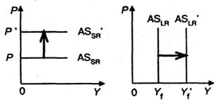 Классическая школа признает только вертикальную конфигурацию этой кривой, а кейнсианская школа – ее горизонтальный и восходящий отрезки. Кейнсианский подход означает, что сдвиг совокупного спроса приводит не только к изменению номинального, но и реального объема совокупного производства, затрагивая тем самым и производство, и занятость (а вертикальный участок кривой AS характеризует полную занятость).