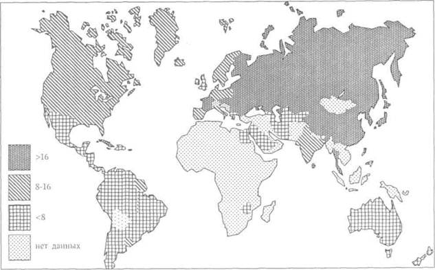 По данным Московского НИИ психиатрии и Государственного научного центра социальной и судебной психиатрии им. В. П. Сербского, в течение 1991-1995 гг. число завершенных самоубийств в России увеличилось в 1,6 раза. Большинство специалистов (социологи, врачи и др.) отмечает, что по уровню самоубийств Россия вышла на одно из первых мест в мире. Карта, опубликованная в журнале «Наше здоровье» (осень 2000 г.), весьма наглядно иллюстрирует распределение завершенных самоубийств по странам и регионам планеты. Автор настоящей книги посчитал возможным привести «суицидологическую» карту конца XX в. (рис. 1) вместо общепринятых таблиц и множества цифровых показателей.