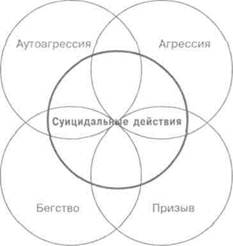 Р. Телле отмечает, что в целом суицидальные действия допускают тенденции, поддерживающие жизнь (жизнь как таковую, даже если речь не идет об этой жизни), и одновременно признают тенденции, разрушающие ее, поэтому приходится констатировать как пассивность (отречение и бегство), так и активность (завладение, деструкция, агрессия). Исходя из этой точки зрения, автор выделяет типы суицида и парасуицида: вызывающее поведение, которое воздействует своей демонстративностью; амбивалентная установка, оставляющая выход из этого состояния; отчаявшаяся суицидальность, которая не должна быть бескомпромиссной, и упорствующее суицидальное поведение, которое непреклонно в поиске смерти. В соответствии с изложенными выше положениями Р. Телле приводит графическую схему Хенслера, отражающую различные тенденции мотивационной структуры суицидальных действий и включающую пересекающиеся тенденции и мотивы (бегство и призыв, аутоагрессия и агрессия). Эта схема в какой-то мере перекликается с приведенными выше тремя составляющими самоубийства К. Меннингера (желания: убить, быть убитым и умереть). В соответствии с представлениями автора одновременное наличие всех трех составляющих, как правило, приводит к смерти суицидента, а отсутствие какого-либо элемента или временная разнесенность этих компонентов самоубийства обусловливает относительно более «мягкие» и менее трагические формы аутоагрессивного поведения. Схема Хенслера представлена ниже (рис. 2).