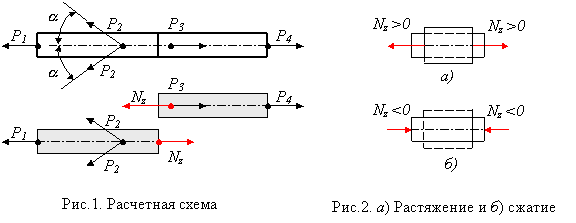 Напомним, что под растяжением (сжатием) понимают такой вид деформации стержня, при котором в его поперечном сечении возникает лишь один внутренний силовой фактор - продольная сила Nz. Поскольку продольная сила численно равна сумме проекций, приложенных к одной из отсеченных частей внешних сил на ось стержня (для прямолинейного стержня она совпадает в каждом сечении с осью Oz), то растяжение (сжатие) имеет место, если все внешние силы, действующие по одну сторону от данного поперечного сечения, сводятся к равнодействующей, направленной вдоль оси стержня (рис. 1). Одна и та же продольная сила Nz при действии на различные части стержня (левую или правую) имеет противоположные направления. Знак Nz зависит от характера вызываемой ею деформации. Продольная сила считается положительной, если вызывает растяжение элемента (рис. 2, а), и она отрицательна, если вызывает сжатие (рис. 2, б).