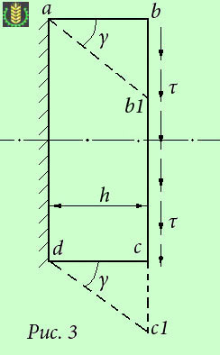 Для установления параметров, характеризующих деформацию при сдвиге, рассмотрим элемент бруса в виде параллелепипеда abcd, на грани которого действуют только касательные напряжения τ, а противоположную грань параллелепипеда представим жестко защемленной (рис. 3).