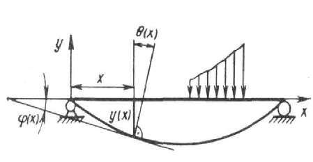 При изгибе ось балки искривляется, а поперечные сечения перемещаются поступательно и поворачиваются вокруг нейтральных осей, оставаясь при этом нормальными к изогнутой продольной оси (рис. 8.22). Деформированная (изогнутая) продольная ось балки называется упругой линией, а поступательные перемещения сечений, равные перемещениям y=y(x) их центров тяжести сечений – прогибами балки.