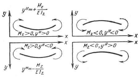 Выбор знака в правой части (8.29) определяется направлением координатной оси y, так как от этого направления зависит знак второй производной y //. Если ось направлена вверх, то, как видно из рис. 8.23, знаки y //и M z совпадают, и в правой части надо оставить знак плюс. Если же ось направлена вниз, то знаки y //и M z противоположны, и это заставляет выбрать в правой части знак минус. Заметим, что уравнение (8.29) справедливо только в пределах применимости закона Гука и лишь в тех случаях, когда плоскость действия изгибающего момента M z содержит одну из главных осей инерции сечения.