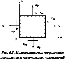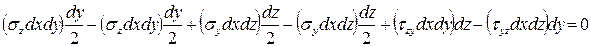 Элементарный параллелепипед должен находиться в равновесии (он не должен вращаться вокруг оси x, проходящей через точку К) (см. рис. 6.3), поэтому суммарный момент всех сил, возникающих по граням относительно этой оси должен быть равным нулю: