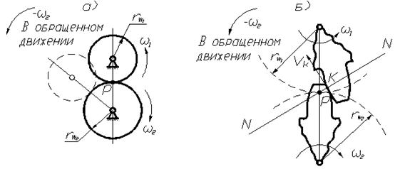 Рассмотрим обращённое движение профилей зубьев зубчатых колёс (рис. 70, б).