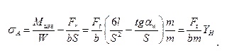 Напряжения сжатия вычитаются из напряжений изгиба. Учитывая, что напряжения изгиба в консольной балке равны частному от деления изгибающего момента Mизг на момент сопротивления корневого сечения зуба W, а напряжения сжатия это сила Fr, делённая на площадь корневого сечения зуба, получаем: