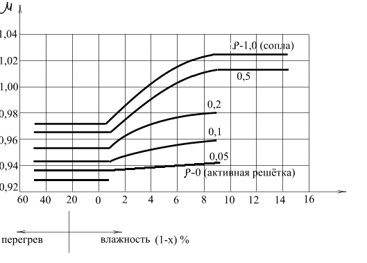 Сурет 2.5 – Бу күйі мен реакция дәрежесіне байланысты соплоық және жұмыс торларындағы шығын коэффициенті
