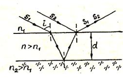 где d – толщина пленки, n – показатель преломления пленки, i - угол падения лучей. В выражении (3.4) учтено, что отражение лучей S1 и S2 происходит на границах двух сред, I и II соответственно, от оптически более плотных сред, и поэтому «потери полуволн» в обоих случаях компенсируют друг друга. Условие интерференционного минимума: