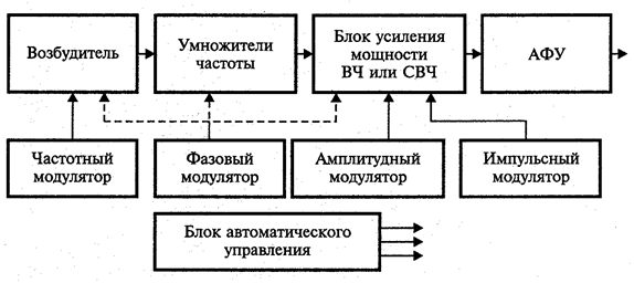 При большом числе частот возбудитель представляет собой цифровой синтезатор частот, в состав которого входит кварцевый автогенератор, называемый опорным, делитель с переменным коэффициентом деления (ДПКД) и устройство автоматической подстройки частоты. Такой синтезатор может быть построен на основе большой интегральной микросхемы. Частота кварцевых автогенераторов обычно не превышает 100 Гц. Поэтому при частоте передатчика больше данного значения в устройство включаются умножители частоты, повышающие частоту сигнала в необходимое число раз. Получение требуемой выходной мощности радиопередатчика осуществляется с помощью блока усиления мощности, каскадно-включенных ВЧ или СВЧ генераторов с внешним возбуждением. При выходной мощности передатчика, превышающей мощность одного прибора, в выходном каскаде происходит суммирование мощностей генераторов. Между выходным каскадом радиопередатчика и антенной включается антенно-фидерное устройство (АФУ). В состав АФУ входят: фильтр для подавления побочных излучений радиопередатчика, датчики падающей и отраженной волны и согласующее устройство. При работе в СВЧ диапазоне вместо последнего обычно применяется ферритовое однонаправленное устройство - вентиль или циркулятор. Частотная модуляция осуществляется в возбудителе радиопередатчика, фазовая - в возбудителе или ВЧ умножителях и усилителях, амплитудная и импульсная - в ВЧ усилителях. С помощью блока автоматического управления выполняются автоматическая стабилизация параметров радиопередатчика (в первую очередь, мощности и температурного режима), защита при нарушении нормальных условий эксплуатации (например, при обрыве антенны) и управление (включение-выключение, перестройка по частоте). При составлении и расчете структурной схемы транзисторного радиопередатчика исходят из его назначения, условий работы и следующих основных параметров: