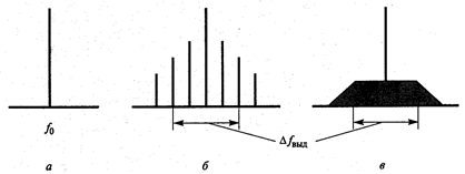 Спектр такого колебания имеет одну составляющую (рис. 2.3, а). При любом виде модуляции - амплитудной, частотной, фазовой и импульсной - спектр сигнала становится или линейчатым (рис. 2.3, б), или сплошным (рис. 2.3, в), занимая определенную полосу частот