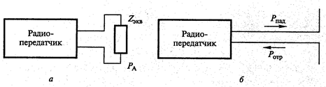 можно определить и вторым способом при непосредственном подключении радиопередатчика к антенне. По связывающему их фидеру распространяются две волны: в прямом направлении - падающая, в обратном - отраженная от антенны (рис. 2.4, б). При этом мощность радиопередатчика