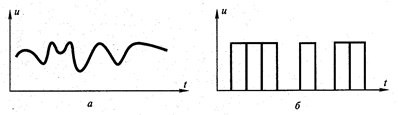 и период их повторения Т. Параметры передаваемого сообщения. Таким сообщением может быть речевая, факсимильная, телевизионная, телеметрическая и другая разнообразная информация, в том числе и считываемая с компьютера. Сообщение может передаваться в форме аналогового (рис. 2.5, а) или цифрового сигнала (рис. 2.5, б). При аналоговом сообщении основным характеризующим его параметром является полоса частот спектра сигнала, при цифровом — число бит в секунду (битом называется единица цифровой информации при двоичном коде это 1 или 0). Параметры, характеризующие допустимые искажения передаваемого сообщения. В результате процесса модуляции, т.е. наложения на несущие колебания исходного сообщения, последнее претерпевает некоторые изменения или, иначе говоря, искажается. В каждом конкретном случае устанавливается вид и норма на эти искажения. Например, при передаче сообщения в виде синусоидального сигнала таким параметром является коэффициент нелинейных искажений, определяющий появление в исходном сигнале 2, 3-й и последующих гармоник.