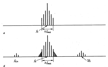 При передаче импульсных сигналов искажения можно характеризовать по изменению формы сигнала - допустимой длительности фронта. Побочные излучения радиопередатчика. В идеальном случае радиопередатчик должен излучать только сигнал на частоте несущей, и его спектр должен укладываться в выделенную полосу частот (рис. 2.6, а). Однако по нескольким причинам, основной из которых является нелинейный характер процессов, протекающих в каскадах радиопередатчика, в спектре излучаемого им сигнала появляются побочные составляющие (рис. 2.6, б). Побочные излучения, лежащие за пределами, но вблизи выделенной полосы частот, называются внеполосными. Кроме них радиопередатчик может излучать гармоники - сигналы с частотой