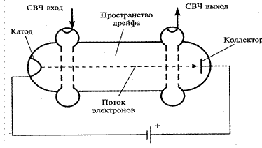 Клистрон используется только в СВЧ диапазоне. В нем имеется два резонатора - входной, к которому подводится сигнал возбуждения, и выходной, с которого снимается сигнал, усиленный по мощности. Носители заряда - электроны - движутся в приборе от катода к коллектору, к которому приложено постоянное напряжение. Проходя сквозь зазор входного резонатора, поток электронов модулируется по скорости. Затем в пространстве дрейфа прибора, расположенном между резонаторами, происходит преобразование одного вида модуляции потока по скорости в другой - по плотности. Усиленный по мощности поток электронов, проходя сквозь зазор выходного резонатора, возбуждает в нем электромагнитное поле. В клистронном генераторе взаимодействие потока с полем, происходящее в зазоре резонатора, носит кратковременный характер, но время пролета носителей от катода к коллектору