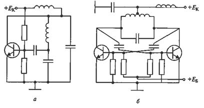 При выполнении (14.6) любое увеличение или уменьшение амплитуды U относительно Uуст возвращает систему в первоначальное состояние, что свидетельствует об устойчивости стационарного режима автоколебаний. Полная электрическая схема однотактного транзисторного АГ с цепью питания и смещения приведена на рис. 14.5, а, двухтактного - на рис. 14.5, б.