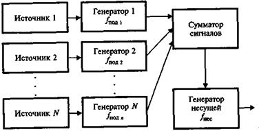 Рис. 19.3. Объединение поднесущих в групповой сигнал,