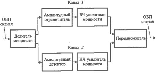 Получение малого уровня нелинейных искажений в ВЧ усилителях мощности является сложной технической задачей, связанной к тому же со снижением КПД радиопередатчика. В схеме двухканального усилителя удается разрешить данную проблему путем раздельного усиления двух сигналов, один из которых содержит информацию о фазовой модуляции, другой - об амплитудной (рис. 20.4). В канале 1 усиливается ВЧ сигнал с постоянной амплитудой, содержащий информацию о фазовой модуляции. Постоянство амплитуды сигнала обеспечивается в канале с помощью включенного на его входе амплитудного ограничителя. В канале 2 усиливается только огибающая сигнала - низкочастотный сигнал, содержащий информацию об амплитудной модуляции. После усиления до требуемой величины мощности сигналы с выходов обоих каналов перемножаются, вновь образуя сигнал ОБП.