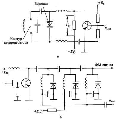 Схема ЧМ с варикапом в контуре автогенератора, приведена на рис. 21.6,а. Схема ФМ с тремя контурами ВЧ усилителя и тремя варикапами, что позволяет увеличить девиацию фазы, изображена на рис. 21.6,б.