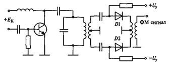 Фазовый модулятор содержит два электронных ключа, в качестве которых используются диоды. Открывая попеременно один или другой электронный ключ, снимают ВЧ сигнал с разных обмоток ВЧ трансформатора и тем самым скачком на Djдев=p меняют фазу сигнала. (На схеме рис. 22.2 отображен случай, когда диод DI открыт, a D2 закрыт.)