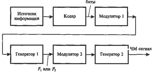 Применение одноступенчатой модуляции не позволяет во многих случаях реализовать преимущества ЧТ и ФТ. Это связано с тем, что в идеальном случае полоса пропускания радиоприемника должна быть равна спектру принятого сигнала. Практически данное требование из-за нестабильности частоты несущей передатчика и частоты гетеродина приемника реализовать не удается: полосу пропускания с учетом названных нестабильностей частоты приходится расширять, что снижает помехоустойчивость. Поэтому, более продуктивным оказывается двухступенчатая модуляция, при которой логические 1 и 0 модулируют сначала поднесущую сравнительно низкой частоты, а затем этой поднесущей модулируют частоту несущей радиопередатчика. Рассмотрим более подробно такой метод двухступенчатой модуляции на примере ЧТ - ЧМ, выполняемой согласно структурной схеме, приведенной на рис. 22.3.