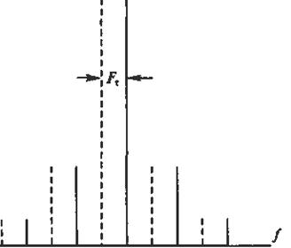 Рассматривая колебание (рис. 22.4,а) как сумму двух амплитудно-модулированных сигналов с частотами F1 и F2, с учетом последней зависимости для огибающей получим спектр, представленный при К=1+N на рис. 22.5. (Сплошные линии относятся к сигналу с частотой F1, пунктирные - F2.)