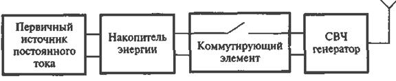 Радиопередатчики в импульсе могут излучать очень большую мощность - в десятки и даже сотни мегаватт. Поскольку, однако, эти импульсы излучаются с большой скважностью q, то, используя принцип накопления энергии паузе между импульсами, мощность первичного источника можно понизить в то же число q раз. Структурная схема такого импульсного модулятора приведена на рис. 23.4