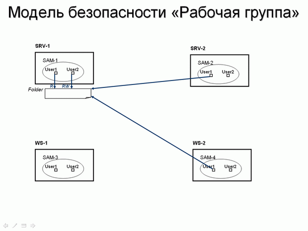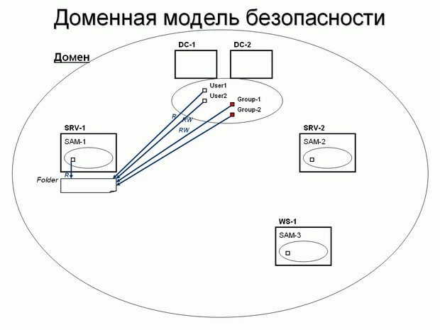 В данном примере изображены два сервера (SRV-1 и SRV-2) и две рабочие станции (WS-1 и WS-2). Их базы данных SAM обозначены соответственно SAM-1, SAM-2, SAM-3 и SAM-4 (на рисунке базы SAM изображены в виде овала). В каждой БД есть учетные записи пользователей User1 и User2. Полное имя пользователя User1 на сервере SRV-1 будет выглядеть как "SRV-1\User1", а полное имя пользователя User1 на рабочей станции WS-1 будет выглядеть как "WS-1\User1". Представим, что на сервере SRV-1 создана папка Folder, к которой предоставлен доступ по сети пользователям User1 — на чтение (R), User2 — чтение и запись (RW). Главный момент в этой модели заключается в том, что компьютер SRV-1 ничего "не знает" об учетных записях компьютеров SRV-2, WS-1, WS-2, а также всех остальных компьютеров сети. Если пользователь с именем User1локально зарегистрируется в системе на компьютере, например, WS-2 (или, как еще говорят, "войдет в систему с локальным именем User1 на компьютере WS-2"), то при попытке получить доступ с этого компьютера по сети к папке Folder на сервере SRV-1 сервер запросит пользователя ввести имя и пароль (исключение составляет тот случай, если у пользователей с одинаковыми именами одинаковые пароли).