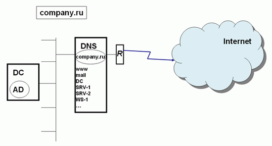 Такой способ максимально упрощает работу системного администратора, но при этом DNS-сервер, доступный для всей сети Интернет, хранит зону company.ru и предоставляет доступ к записям этой зоны всем пользователям Интернета. Таким образом, внешние злоумышленники могут получить полный список внутренних узлов корпоративной сети. Даже если сеть надежно защищена межсетевым экраном и другими средствами защиты, предоставление потенциальным взломщикам информации о структуре внутренней сети — вещь очень рискованная, поэтому данный способ организации пространства имен AD не рекомендуется (хотя на практике встречается довольно часто).