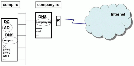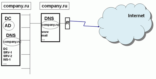 В данном случае на различных серверах DNS создаются различные зоны с одним и тем же именем company.ru. На внутреннем DNS-сервере функционирует зона company.ru.для Active Directory, на внешнем DNS-сервере — зона с таким же именем, но для ссылок на внешние ресурсы. Важный момент — данные зоны никак между собой не связаны — ни механизмами репликации, ни ручной синхронизацией.