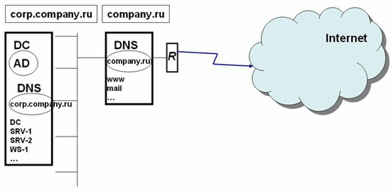 В данном примере корневой домен компании company.ru служит для хранения ссылок на внешние ресурсы. В домене company.ru настраивается делегирование управление поддоменом corp.company.ru на внутренний DNS-сервер, и именно на базе домена corp.company.ru создается домен Active Directory. В этом случае во внешней зоне хранятся ссылки на внешние ресурсы, а также ссылка на делегирование управления поддоменом на внутренний DNS-сервер. Таким образом, пользователям Интернета доступен минимум информации о внутренней сети. Такой вариант организации пространства имен довольно часто используется компаниями.